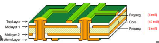 A 4-layer PCB is a type of multi-layer PCB that consists of four conductive copper layers separated by insulating dielectric material. These layers are laminated together to form a single board, with each layer serving a specific purpose. The typical layer stack-up of a 4-layer PCB is as follows:
