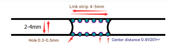 As shown in Figure 1-5, when designing the link strip, it is generally necessary to design a length of 4-5mm, the hole is a non-metallized hole, the size is generally 0.3mm-0.5mm, and the spacing between holes is 0.8-1.2mm;