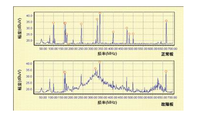Figure 5 is the spectrum diagram of the normal board and the faulty board. By comparing, it is easy to find that there is an abnormal broadband interference on the faulty board.