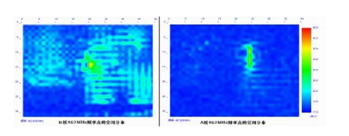 From the spatial diagram, it can be seen that the total electromagnetic interference distribution area of board A is much smaller than that of board B. Let’s take a look at the electromagnetic interference distribution at a certain frequency point. From the electromagnetic interference distribution of the frequency point of 462MHz shown in Figure 8, the amplitude of board A is small and the area is very small. The amplitude of board B is large and the distribution area is particularly wide.