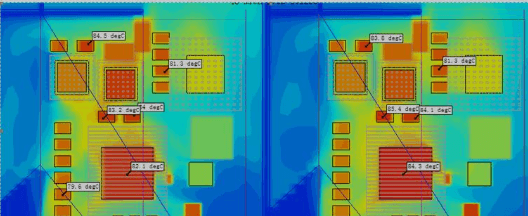 Thermal vias can effectively reduce the junction temperature of the device and improve the uniformity of the temperature in the thickness direction of the single board, which provides the possibility of taking other heat dissipation methods on the back of the PCB. Through simulation, it is found that compared with no thermal vias, the thermal vias with a device thermal power consumption of 2.5W, a spacing of 1mm, and a center design of 6×6 can reduce the junction temperature by about 4.8°C, and the temperature difference between the top and bottom surfaces of the PCB is reduced from the original 21°C to 5°C. After the thermal via array is changed to 4×4, the junction temperature of the device is increased by 2.2°C compared with 6×6, which is worthy of attention.