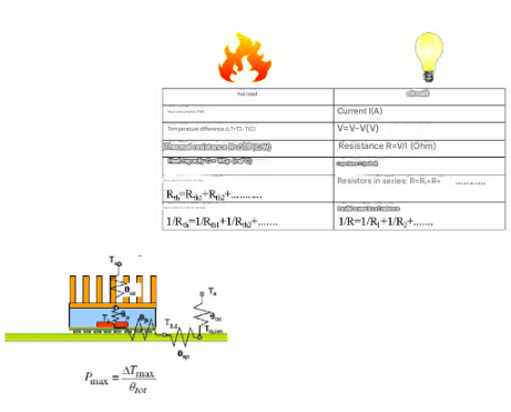 • Therefore, the denominator in the above formula can be understood as the resistance of the heat conduction process using the concept of resistance in electricity, called thermal resistance, with a unit of ℃/W. Its physical meaning is how many degrees of temperature difference is required to transfer 1W of heat.