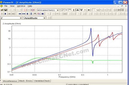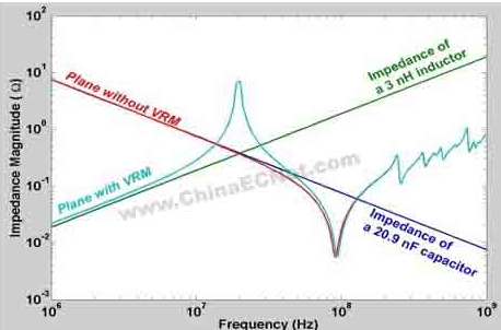 As can be seen from the figure, the blue line of example a, the input impedance of the power supply system observed at the location of the integrated circuit chip is capacitive at low frequencies. As the frequency increases, the first natural resonance peak appears at a frequency of 800MHz. The wavelength of this frequency corresponds to the size of the power ground plate.