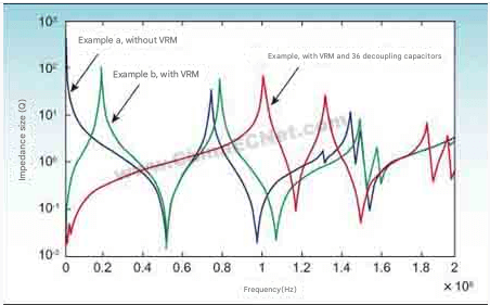 Figure 5 shows an example. The red line is the input impedance obtained after placing some discrete decoupling capacitors on the PCB.