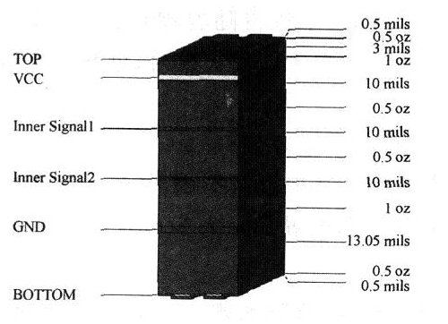 In actual design, board layer characteristics (such as thickness, dielectric constant, etc.) as well as line length, line width, line spacing, signal rise time, etc. will all affect crosstalk. The following uses Mentor Graphie’s signal integrity simulation software Hyperlynx to analyze the above factors affecting crosstalk. First, a two-line crosstalk model is established in Hyperlynx, as shown in Figure 4. The line width of the two lines is 5 mil, the line length is 6 in, and the line spacing is 5 mil. Both lines are top-layer microstrip lines with a characteristic impedance of 49.5Ω. Both lines are terminated with a 50Ω resistor to eliminate the influence of reflection. The driver of the interference line uses the IBIS model of CMOS process devices, with a voltage of 3.3 V and a frequency of 100 MHz. The dielectric constant of the PCB is 4.3, and it is a six-layer board. Its stacking structure is shown in Figure 5.
