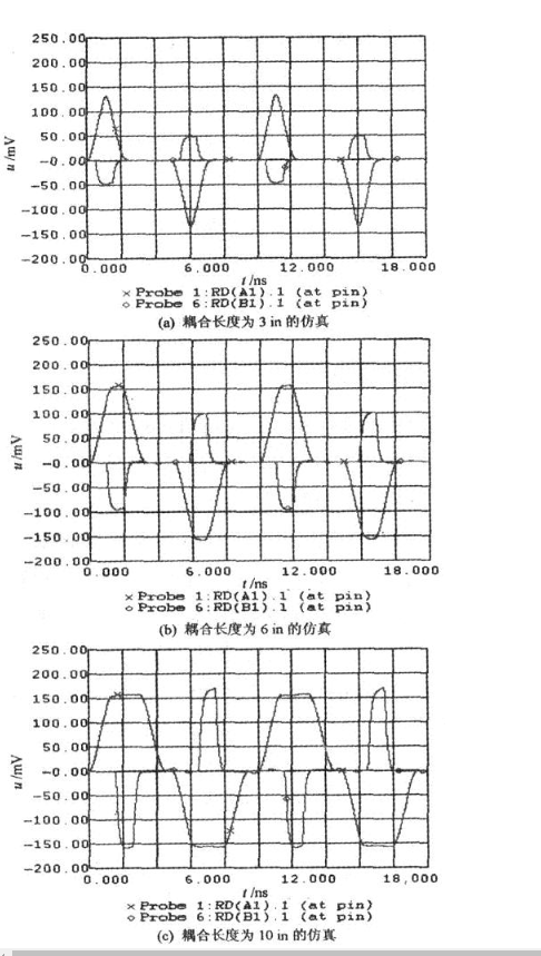 Figure 6 (a) is the crosstalk waveform with a coupling length of 3 in, where the near-end crosstalk peak is 126.34 mV and the far-end is 43.01 mV; Figure 6 (b) is the crosstalk waveform with a coupling length of 6 in, where the near-end crosstalk peak is 153.23 mV and the far-end is 99.46 mV; Figure 6 (c) is the crosstalk waveform with a coupling length of 10 in, where the near-end crosstalk peak is 153.23 mV and the far-end is 163.98 mV. It can be seen that the far-end crosstalk peak is proportional to the coupling length, and the longer the coupling length, the greater the crosstalk; while for the near-end crosstalk, when the coupling length is less than the saturation length, the crosstalk will increase with the increase of the coupling length, but when the coupling length is greater than the saturation length, the near-end crosstalk value will be a stable value.