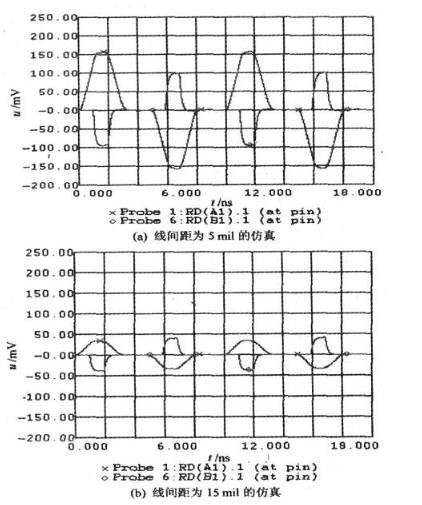 The following is to keep other settings unchanged and examine the influence of changes in line spacing on crosstalk. The line spacing is set to 5 mil and 15 mil respectively, and the simulation waveform is shown in Figure 7.