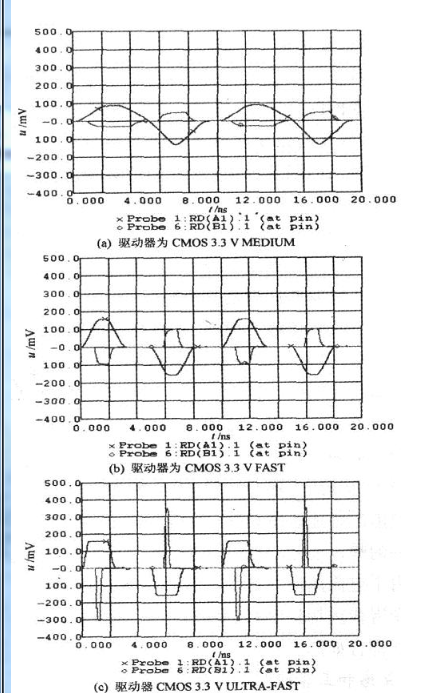 The following examines the effect of the change in rise time on crosstalk, and other settings remain unchanged. Set the driver to CMOS 3.3 V MEDI-UM; CMOS 3.3 V FAST; CMOS 3.3 V ULTRA-FAST respectively, and the simulation waveform is shown in Figure 8.