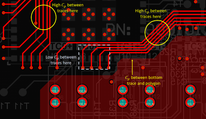 - A 3D electromagnetic simulation is run to extract parasitic capacitance between the traces.