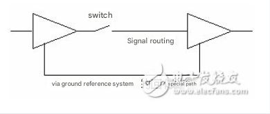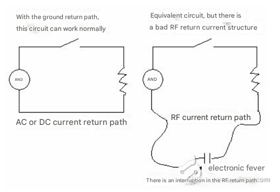 As shown in Figure 6, a switch is connected in series with the source drive end (E). When the switch is closed, the circuit works normally according to the desired result; when the switch is open, it has no function. In the time domain, the desired signal reaches the load from the source. This signal must have a return path to make this circuit valid, which is usually through a 0V (ground) return structure (Kirchhoff’s law). The flow of RF current is from the source to the load, and must return through the path with the lowest possible impedance, usually through a ground trace or ground plane (mirror plane). The existence of RF current is best explained using Ampere’s law.