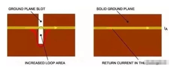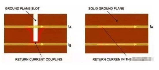 DC current always tends to flow along a low-resistance path. Similarly, high-frequency current also prefers to flow through the path with the lowest resistance. Therefore, for a standard PCB microstrip line above the ground layer, the return current tries to flow into the ground area just below the lead. As described in the lead coupling section above, the cut ground area will introduce various noises, which will increase crosstalk by magnetic field coupling or current convergence (Figure 7).