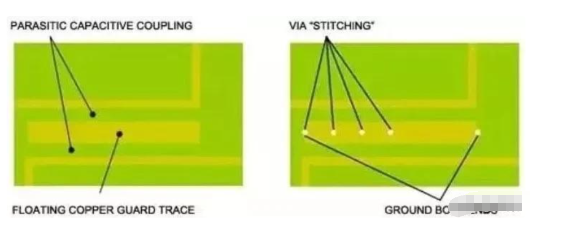 Filling ground is also called a guard line. It is usually used in designs where it is difficult to lay a continuous ground area in the circuit or where sensitive circuits need to be shielded (Figure 8). The shielding effect is increased by placing ground vias (i.e., via arrays) at both ends of the lead or along the line. Do not mix guard traces with traces designed to provide return current paths, as this layout will introduce crosstalk.