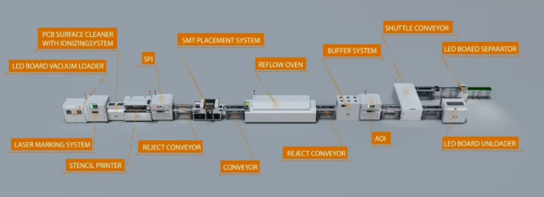 SMT is a method for constructing electronic circuits where components are mounted directly onto the surface of printed circuit boards (PCBs). Unlike through-hole technology, SMT allows for smaller components, higher component density, and automated assembly, making it essential for modern electronics manufacturing. A typical SMT production line integrates multiple automated machines to perform sequential operations with minimal human intervention.