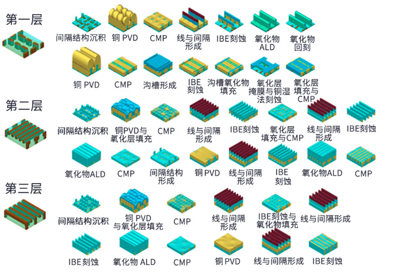 All metal layers above the middle of the line are made on a plane, so it is superior to the complex interconnect topology of FinFET (fin field effect transistor) devices and is an alternative to PVD/IBE metal lines. Figure 3 shows the independent structure of each metal layer and the necessary steps to create a three-layer metal FinFET structure using PVD/IBE.