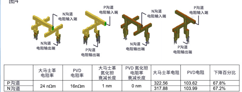 Figure 4 shows a 3D model diagram of a FinFET device using the Damascus process and PVD process. These models draw the resistance measurement points of the P and N channels. The table below the 3D model compares Damascus and PVD resistor values for P and N channel. The table shows that using IBE/PVD can reduce the resistance by 67% compared to Damascus deposition.