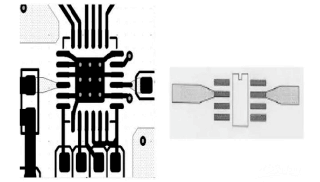 When the RF trace width is significantly larger than the IC device pin width,use a gradient width approach to the trace contacting the chip,as shown in Figure 8