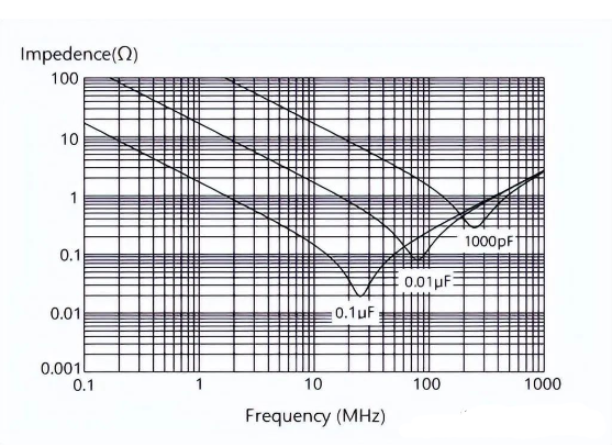 When the frequency is low, it exhibits the characteristics of a capacitor, that is, the impedance decreases with the increase of frequency. Resonance occurs at a certain point, and the impedance of the capacitor is equal to the ESR. Above the resonance, due to the effect of ESL, the impedance of the capacitor increases with the increase of frequency, making the capacitor exhibit the impedance characteristics of an inductor. As the impedance of the capacitor increases, the bypass effect on high-frequency noise weakens or even disappears.