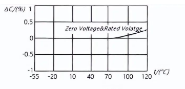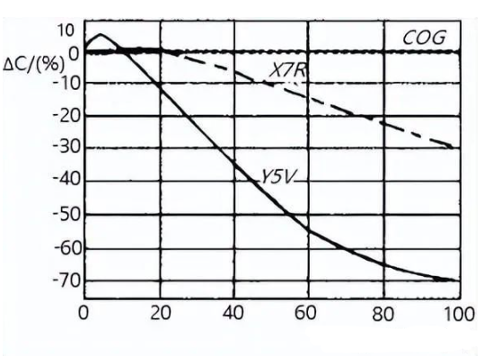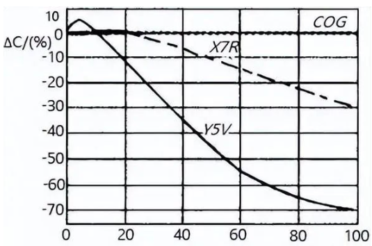 It can be seen that the capacitance of COG capacitors hardly changes with temperature. The capacitance change of X7R capacitors within the rated operating temperature range is within 12%, and the capacitance change of YSV capacitors within the rated operating temperature range is more than 70%.