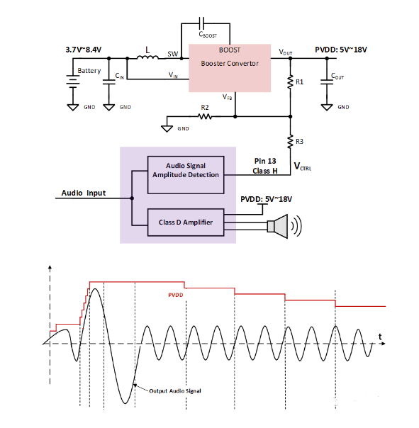 According to the characteristics of the music signal, ACM3108 provides a control signal to control the FB of the chip, thereby controlling the boost PVDD
