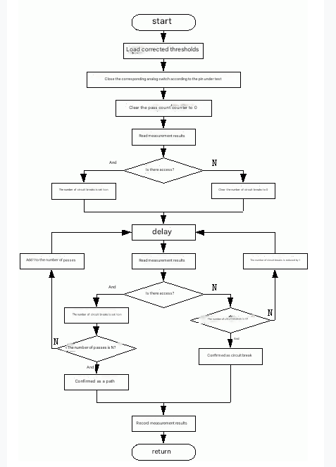 In order to eliminate the influence of capacitance components and analog switch jitter, the measurement time needs to be extended, and to eliminate the influence of inductance components, the induced electromotive force needs to be used to determine in a very short time. For this reason, two counters are set in the program: the path count counter and the disconnection count counter. The purpose of setting the number of paths N is to eliminate the influence of false paths caused by capacitor charging at the moment of analog switch closing. That is, when the cumulative reading of N paths is obtained, the charging of the capacitor is generally completed, and the measured points are confirmed to be connected. The number of disconnections n is set to eliminate the interference caused by the jitter of the analog switch. Generally, when the disconnection results are measured n times in succession, it indicates that the jitter of the analog switch has ended, and it can be confirmed to be disconnected. However, because the induced electromotive force of the inductor is the largest at the moment of analog switch closing, and then drops rapidly, if the first and second measurement results are both disconnected, it is confirmed to be disconnected. Due to the contradictions between several situations, the values of the counter and delay are determined based on the actual situation after weighing the three situations.
