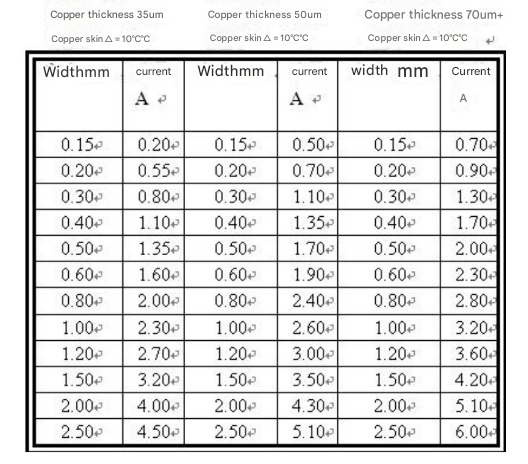The current carrying capacity of copper foils of different thicknesses and widths is shown in the table below: