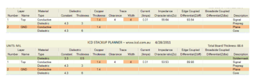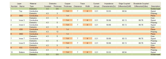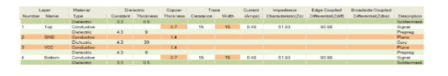 A typical four-layer board stackup is shown below.Calculating the substrate’s characteristics and differential impedance.