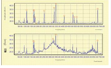Figure 5 is the spectrum diagram of the normal board and the faulty board. By comparison, it is easy to find that there is an abnormal broadband interference on the faulty board.
