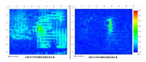 From the spatial diagram, it can be seen that the total electromagnetic interference distribution area of board A is much smaller than that of board B. Let’s take a look at the electromagnetic interference distribution of a certain frequency point. From the electromagnetic interference distribution of the frequency point of 462MHz shown in Figure 8, the amplitude of board A is small and the area is very small. The amplitude of board B is large and the distribution area is particularly wide.