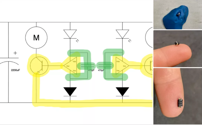 ▲ Direct surface-mount device welding to form a tiny dual-motor drive circuit