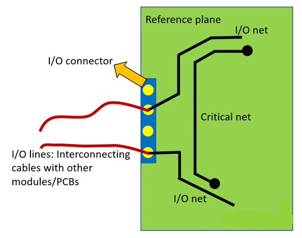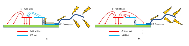 Noise will enter through the I/O connection line and couple to the key signal (clock or sensitive signal) through the I/O connection line inside the PCB, as shown in Figure 3a. Similarly, the key signal (clock or high-speed signal) will couple the noise to the I/O signal routing inside the PCB and radiate outward through the I/O connection line, as shown in Figure 3b: