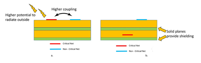 On high-speed PCBs (> 100MHz), high-frequency signals have a short wavelength and high radiation efficiency, so that the high-speed signal routing itself forms an antenna effect, especially when the routing is placed on the top or bottom layer. This unwanted radiation can couple to adjacent traces or even nearby interface connections. We recommend drawing high-speed signal traces on the middle layer of the PCB, as shown in Figure 4b. This helps control the electromagnetic field generated by high-speed signals and avoids unexpected coupling in the form of crosstalk or electromagnetic interference. If the high-speed trace is on the surface layer, the trace should be as short as possible. When the trace is smaller than the electrical minimum size (1/10 wavelength), the antenna effect will be greatly reduced. As shown in Figure 4: