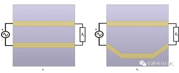 In order to compare the radiation of differential signal routing, the following circuit simulation is performed. Figure 6a and Figure 6b are two sets of symmetrical and asymmetrical routing, respectively. The high-frequency differential signal is input at the left end of the routing, and the load is terminated at the right end.
