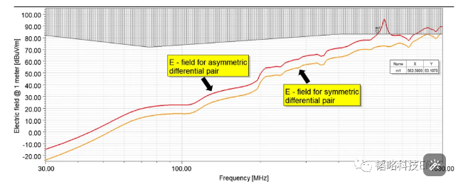 At a distance of 1m, the radiation emission is compared and tested. In the frequency band of 30MHz-1GHz, the noise value of symmetrical routing is 8-10db lower than that of asymmetrical routing, as shown in Figure 8.
