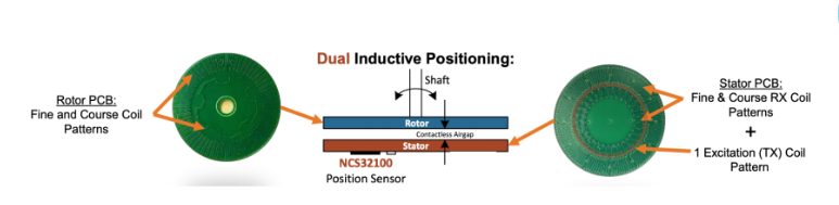 ONSEMI’s NCS32100 dual inductor position sensor achieves excellent non-contact position accuracy of better than +50 arc seconds or 0.0138 degrees of mechanical rotation using two simple and innovative PCB pads. One PCB is attached to the motor stator (stationary portion) while the other single-layer PCB is attached to the rotor or shaft. The two PCBs are placed in parallel, separated by an air gap of 0.1mm to 2.5mm. The NCS32100 is located on the stator PCB.