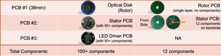 A typical optical solution requires a total of three PCBs – the optical disc, the stator PCB, and the LED driver PCB, with approximately 100 components required to implement the full functionality.