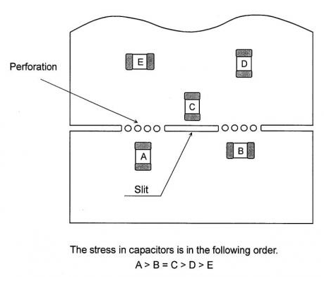 When placing chip capacitors or other vulnerable devices on the edge of the PCB, the direction of the PCB board must be considered. The figure shows the stress magnitude comparison of the device when various placement methods are used.