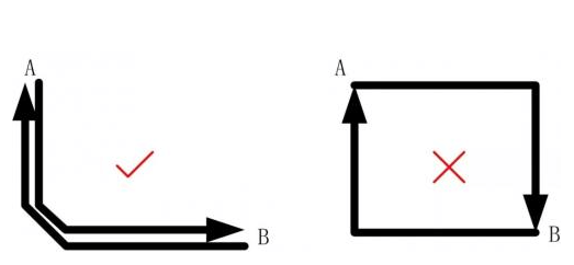 In addition, if the control line is very long, the pair of lines going back and forth should be close, or the two should be placed on two surfaces of the PCB and facing each other, so as to reduce its loop area and avoid being interfered by the electromagnetic field of the power part. As shown in Figure 2, the correct and incorrect signal line routing methods between points A and B are illustrated.