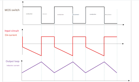 Unlike buck, the inductor is in the input loop, and its current waveform is a three-legged wave, while the current in the output loop is the current of the diode, which has a sudden change.