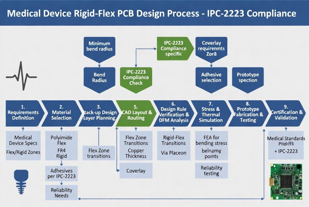 Figure 2: Design workflow for medical rigid-flex PCB development emphasizing IPC-2223 and ISO 13485 compliance checkpoints. Alt text: Medical Device Rigid-Flex PCB design process flowchart with validation gates for biocompatibility and reliability testing.