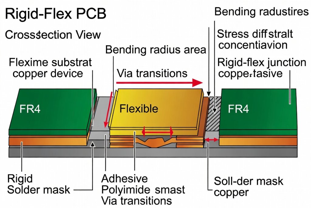 Figure 1: Cross-sectional analysis of medical-grade rigid-flex PCB construction showing polyimide flex layers and FR-4 rigid sections. Alt text: Medical Device Rigid-Flex PCB cross-section diagram illustrating IPC-2223 compliant layer transitions and copper trace routing.
