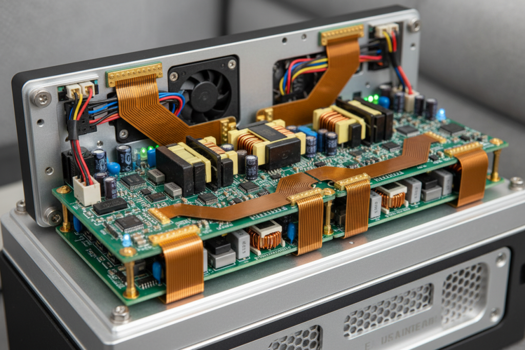 Figure 4: High-current rigid-flex PCB implementation in portable diagnostic equipment demonstrating thermal management and space optimization. Alt text: Medical Device Rigid-Flex PCB with heavy copper traces in portable MRI gradient amplifier system.