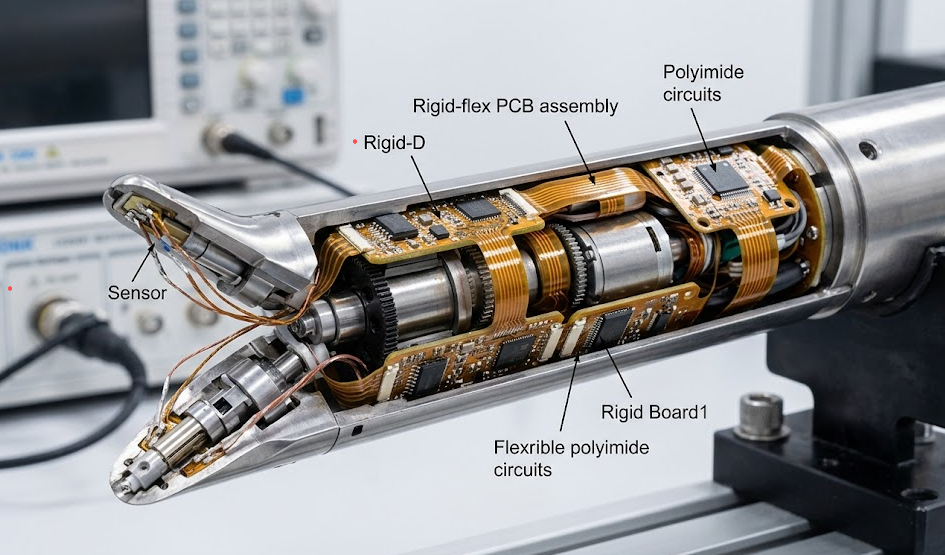 Figure 3: Internal rigid-flex PCB routing in robotic surgical instrument showing dynamic flex capability and high-density interconnects. Alt text: Medical Device Rigid-Flex PCB application in robotic surgery showing flex-to-rigid transitions in sterile surgical environment.