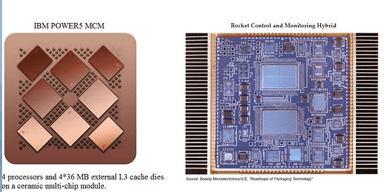 MCM is also a packaging technology that appeared in the 1980s. Its characteristic is that multiple chips or even bare dies are integrated into one package through gold wire bonding and substrate materials. The size and cost of the module after MCM packaging can be greatly reduced. At the same time, since each chip in the module does not need to be packaged separately and the wiring between chips is shorter, it can provide better transmission performance. In addition, due to the high integration, it is easy to perform centralized shielding and protection, so the system reliability is higher than that of discrete devices. MCM technology can integrate chips of different processes in one package, so it is very flexible to use and can build a hybrid system of analog, digital, RF, and passive devices such as resistors and capacitors. The following figures show two MCM chips developed by IBM and Boeing respectively.