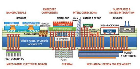 SoP is a packaging technology that appeared at the beginning of this century and can be considered a further upgrade of SiP technology. In addition to being able to complete 3D stacking and packaging of multiple chips and passive devices like SiP, thin film technology and nanomaterials are also used to directly integrate some commonly used passive devices such as resistors, capacitors, filters, waveguides, couplers, antennas and even biosensors onto the package substrate. This reduces the trace length on the substrate from mm to um or even nm, further improving system performance and integration. The following figure is an example of SoP chip application.