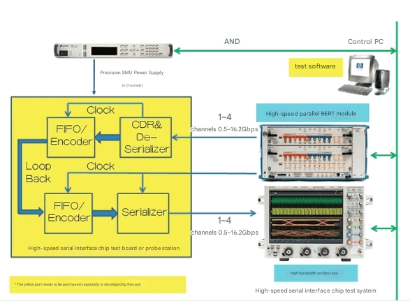 In the test, a high-performance multi-channel bit error meter is used to generate multiple serial excitation signals and clocks to the chip under test. After the data is looped back, it is sent back to the bit error meter for bit error rate statistics or connected to a high-bandwidth oscilloscope for signal quality analysis. During the bit error rate test, random jitter, deterministic jitter, common mode noise, differential mode noise, and ISI inter-symbol interference can be added to the signal to verify the receiver’s tolerance for poor signals.