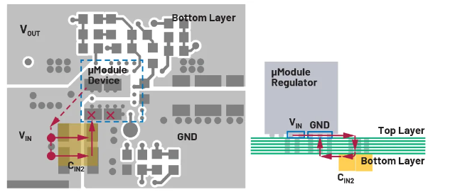- Use multiple small ceramic capacitors in parallel to reduce equivalent series inductance (ESL).