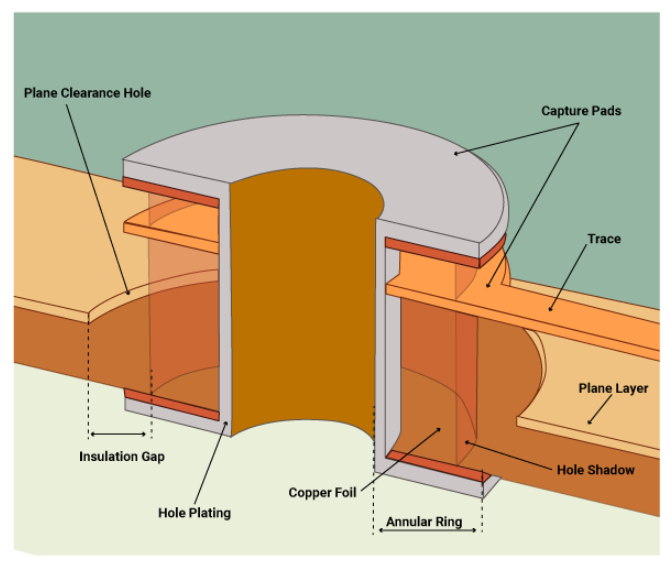 - Surface mount (SMD) pads: For components mounted directly on the board surface