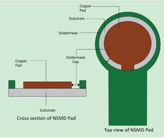 - Solder mask defined (SMD) vs non-solder mask defined (NSMD) pads