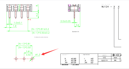 Continue with the above figure, purchase WJ124-3.81-4P_WJ124-3.81-4P (KANGNEX) components according to the design requirements. The pin 1.3mm is correct.
