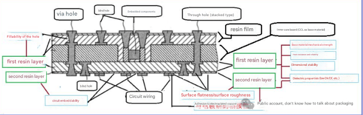From the perspective of “function sharing”, you can refer to the two-layer resin film structure diagram shown in the Hitachi Chemical patent in the above figure to deepen your understanding. The first resin layer (referred to as “A layer” in some Hitachi Chemical patents) is mainly responsible for ensuring the following key properties of the substrate: the strength of the entire film substrate (with elastic modulus as the main evaluation index), heat resistance reliability (with glass transition temperature Tg and cycle endurance as evaluation criteria), dielectric properties (with dielectric constant Dk, dielectric loss Df and transmission loss as references), dimensional stability (with thermal expansion coefficient CTE as evaluation basis), and in the case of through holes and blind holes, ensuring sufficient embedding of the resin in the hole (called “hole embedding property”).